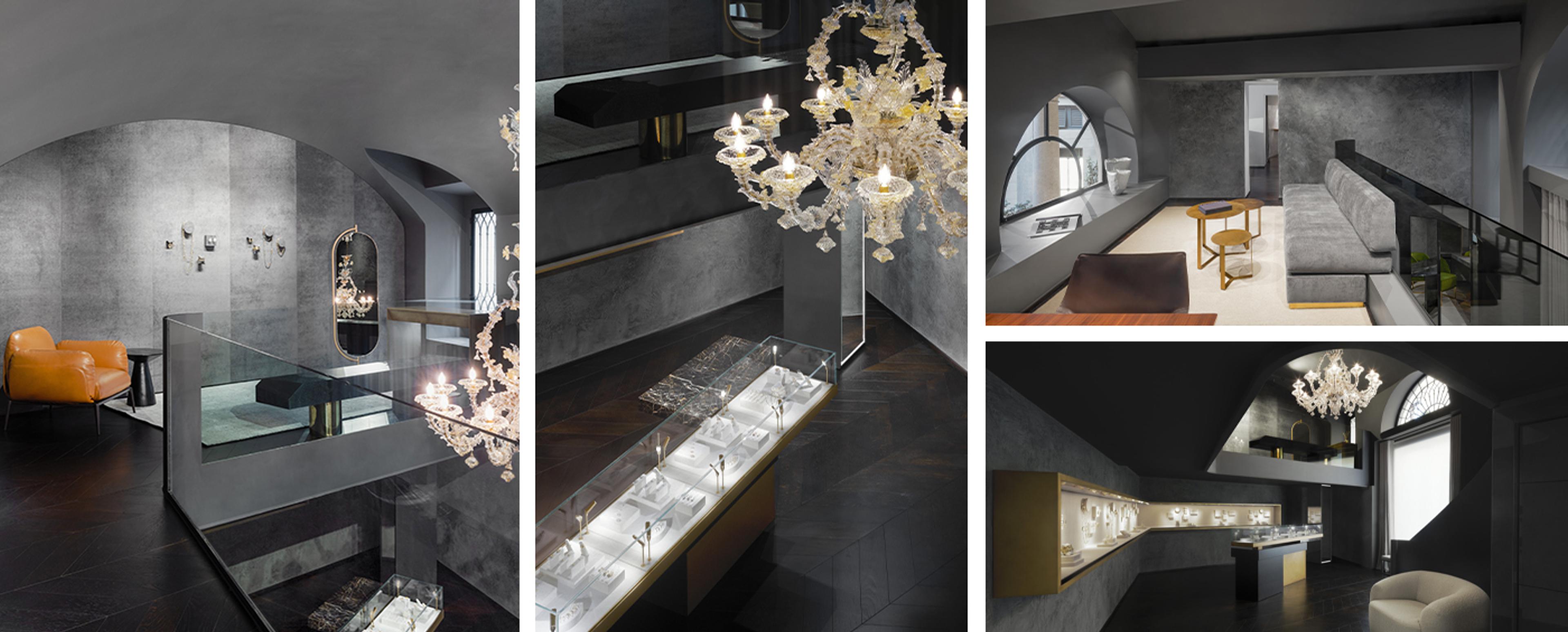 Einzelhandelsprojekt in Mailand, Italien, für die Ippolita-Boutique. Die dunklen Innenräume werden durch kostbare Details und exquisit gefertigte Möbelstücke aufgewertet, die die ausgestellten Schmuckstücke in den Vordergrund stellen.