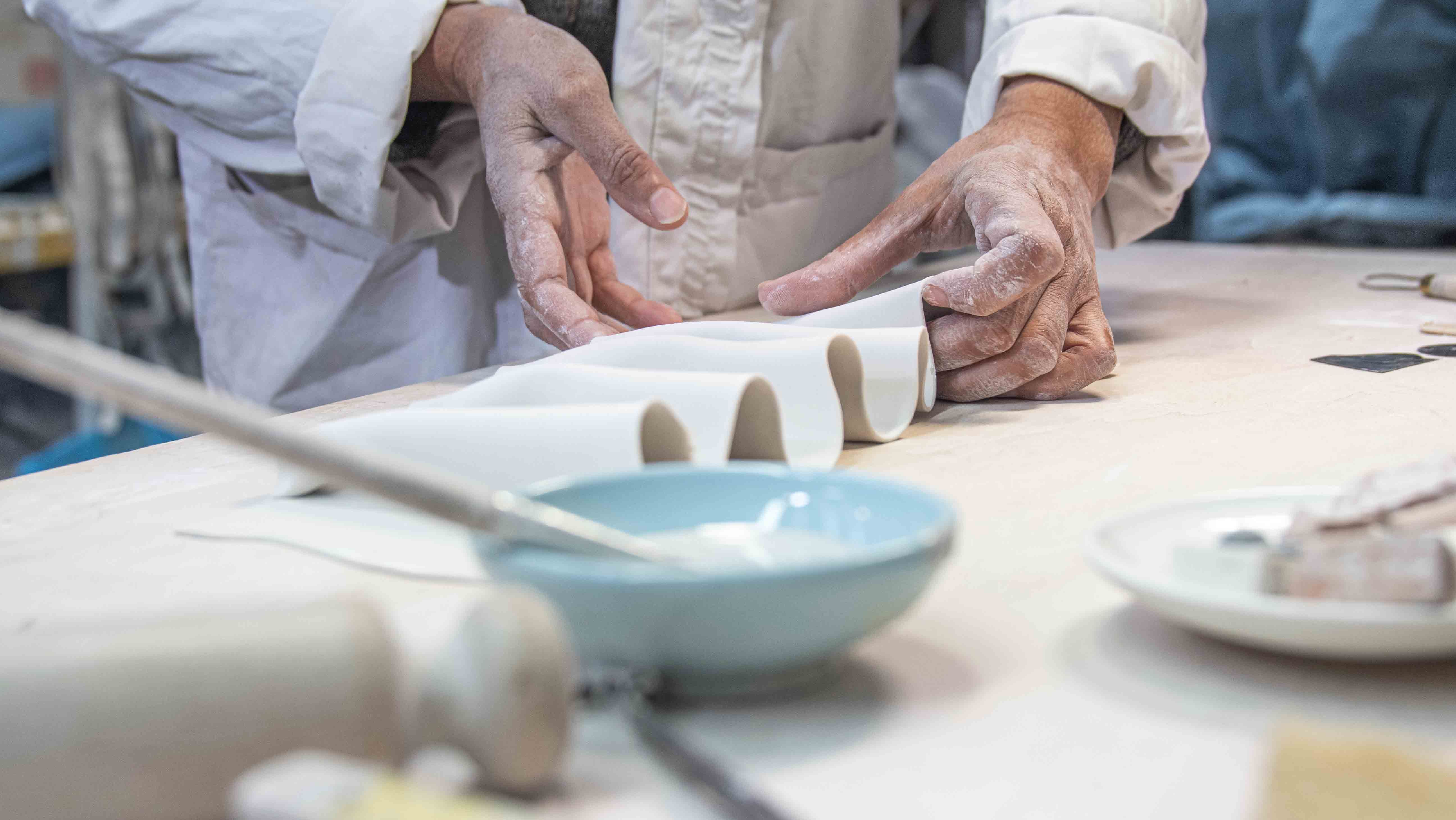 Alles beginnt mit einem missgestalteten Stück Ton, das wir tagelang bearbeiten, um daraus einen Prototyp für das fertige Stück zu machen. Wir fertigen eine Gipsform des Prototyps an und gießen unsere Mischung aus verschiedenen, sorgfältig ausgewählten Porzellantonen. Sobald wir das Objekt aus der Form genommen haben, trocknen wir es und brennen es bei 920 Grad Celsius. Anschließend glasieren wir es mit einem Airbrush oder durch Eintauchen und brennen es erneut bei 1260 Grad. Nur so erhält das Porzellan die Festigkeit und Haltbarkeit, die es auszeichnet. Ganz zum Schluss fügen wir mit dem Pinsel Gold- und Platin-Akzente hinzu und brennen das Stück dann noch einmal bei 790 Grad.