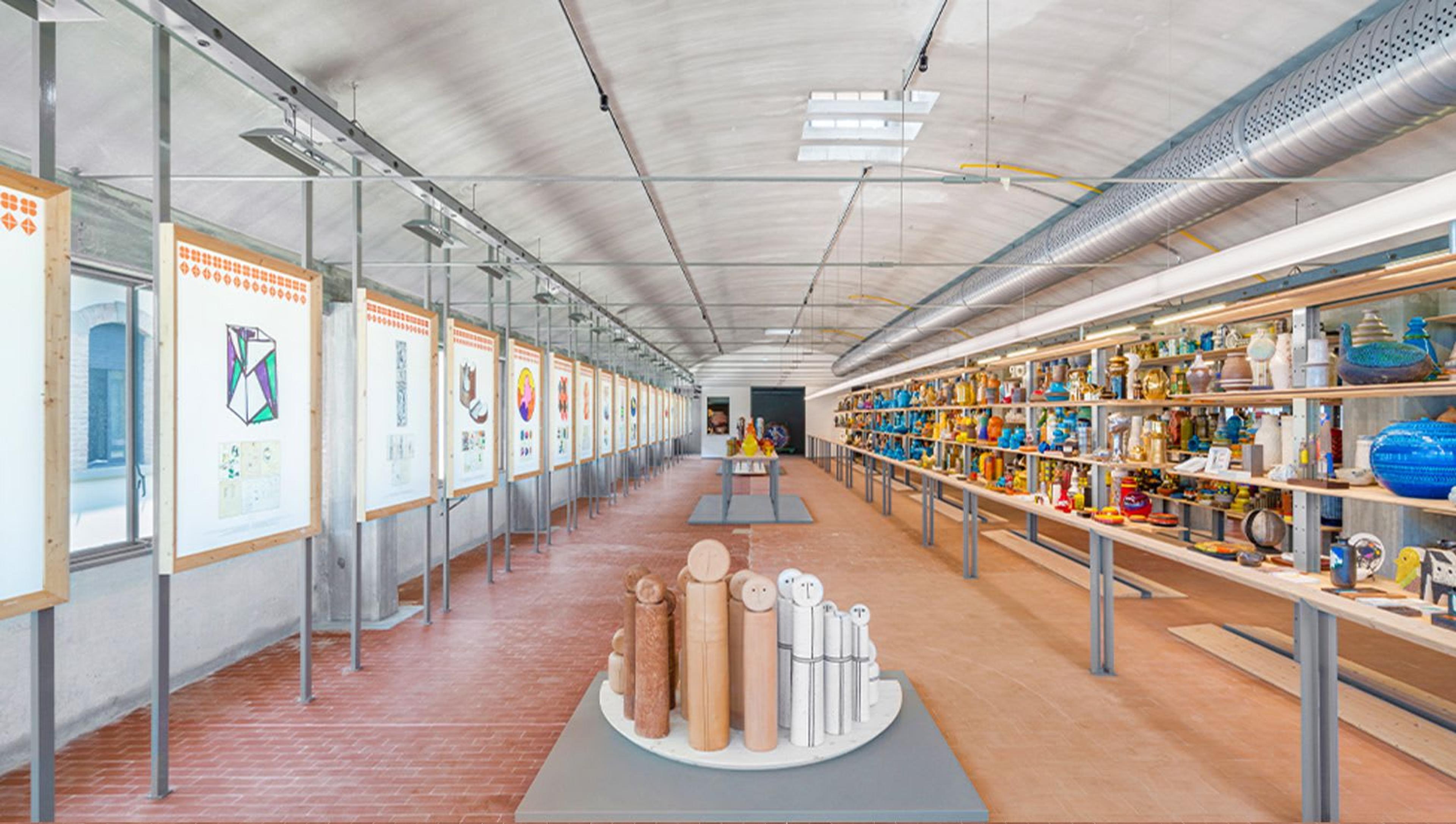 Die Einrichtung ist das Ergebnis museografischer und kuratorischer Recherchen, bei denen eine Vielzahl bunter Stücke auf ortsspezifischen Tannenholzregalen aufgereiht wurde. Außergewöhnliche Kreationen wie Rimini von Aldo Londi, die Totems von Ettore Sottsass oder das Werk Il dormiente con il coccodrillo (Die Schlafenden und die Krokodile) von Mimmo Paladino stehen in der Mitte des Raumes und zeichnen sich durch ihre Einzigartigkeit und ihre Größe aus. Das letzte Regal bleibt leer, um Platz für neue kreative Produktionen und Kollaborationen zu schaffen.