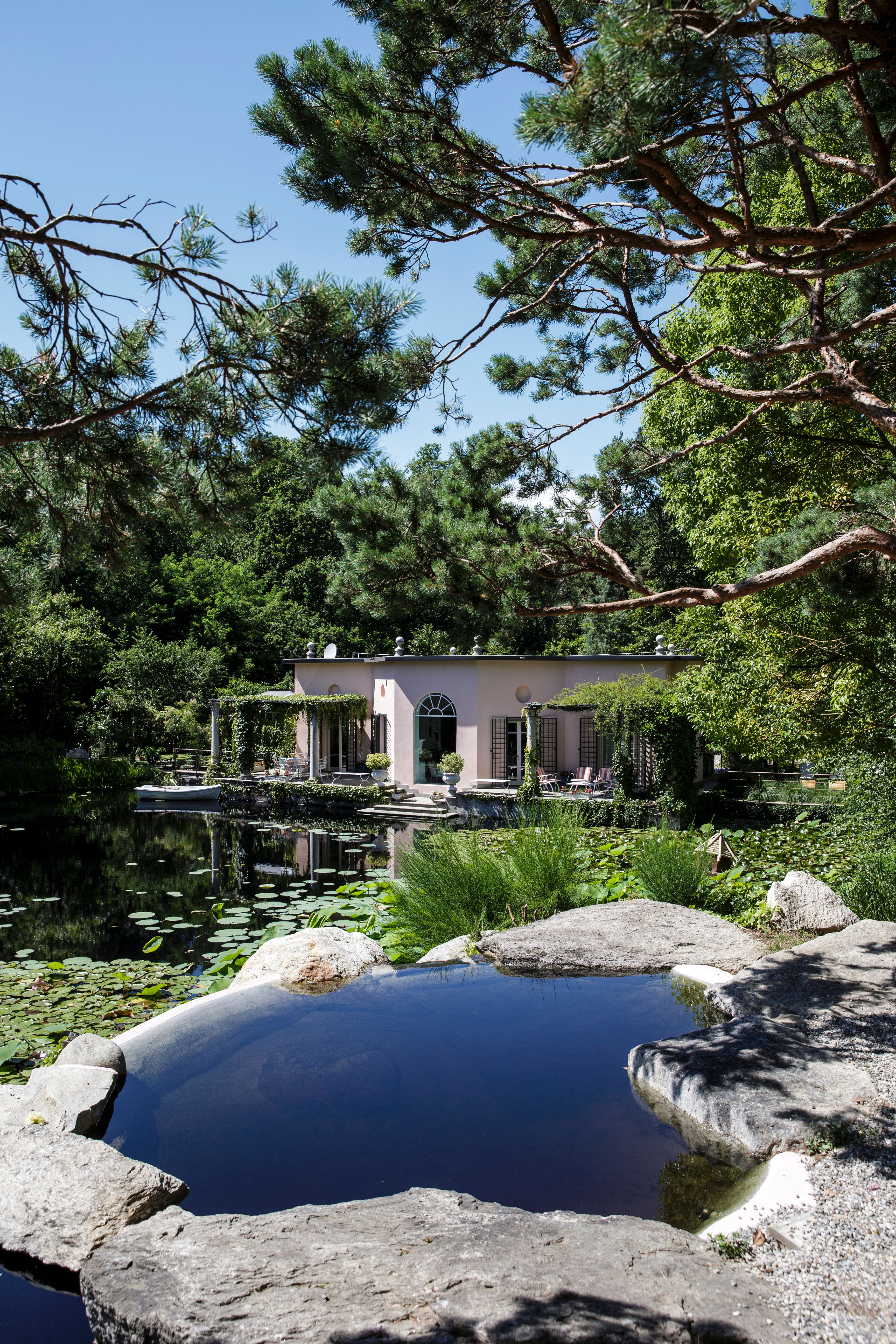 La Foleia is a secret oasis hidden in the green countryside of Piedmont. Composed by a splendid octagonal villa and a neoclassical pavilion, the two buildings mirror each other on either side of a fairytale-like private lake, covered by colorful water lilies and lotuses.