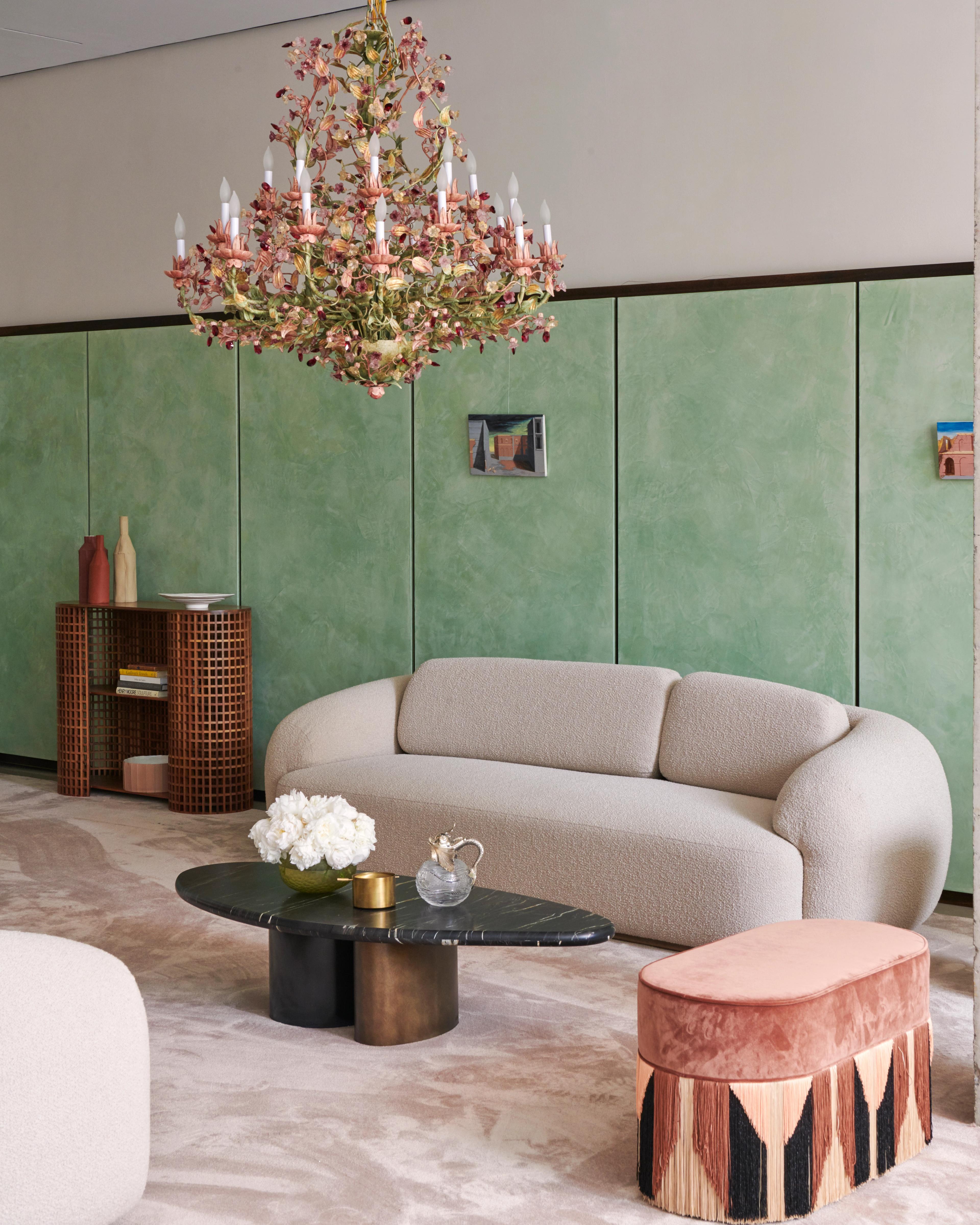 Throughout the space, a warm palette of earth tones that recalls the hills of Tuscany creates a welcoming atmosphere. Inviting armchairs and sofas are placed alongside intricately decorated room dividers and sculptural tables. Above, chandeliers with floral motifs catch the eye, illuminating a wide showcase of decorative objects made from Murano glass, terracotta, hand-painted ceramic, and silver.