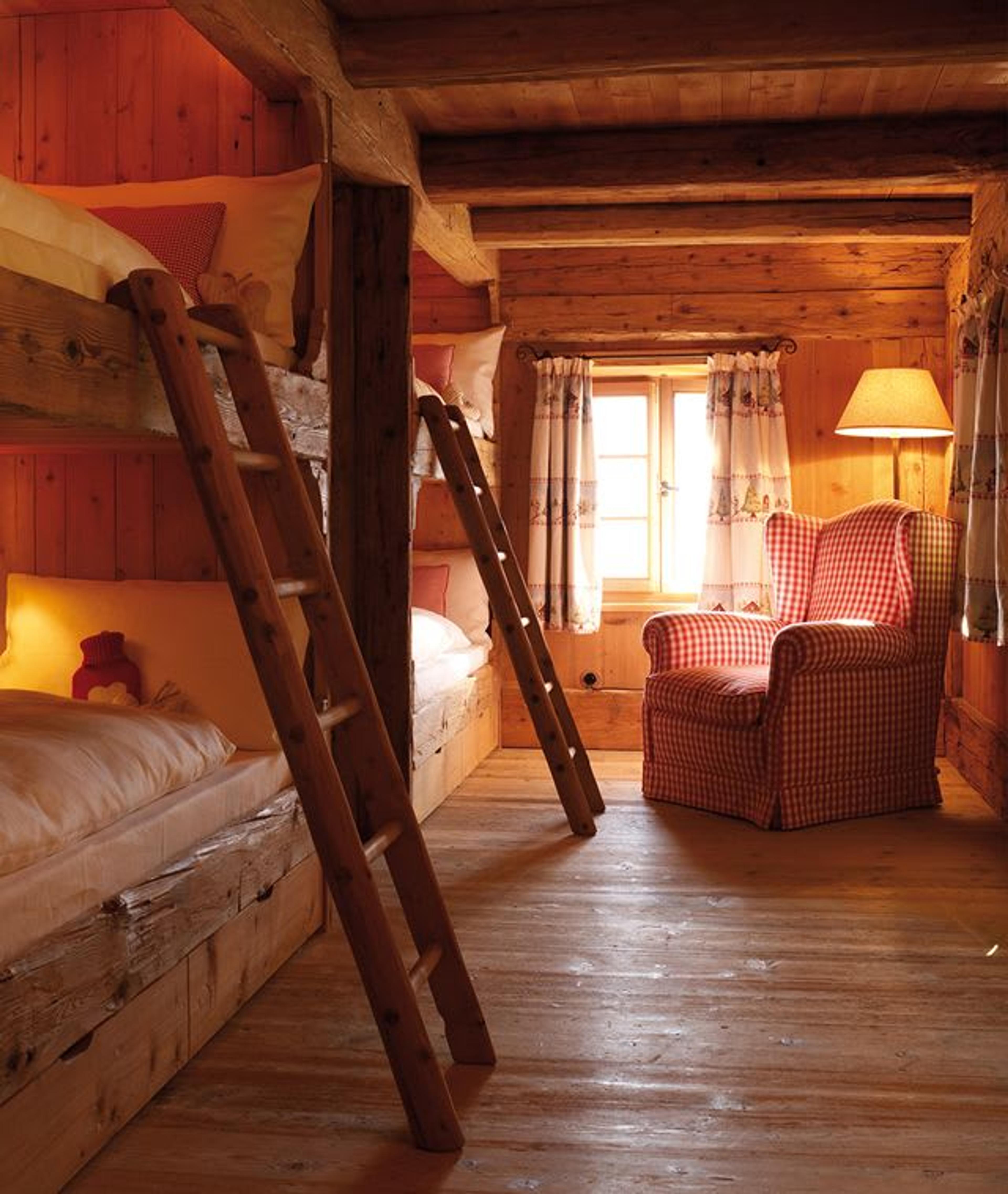 On the upper floor, the guest finds a charmingly designed lounge where to relax around the crackling warmth of the fireplace. Moreover, there are three double suites and a room with characteristic wooden bunk bed for children: in these rooms the local wood warms the environment and recreates a characteristic atmosphere. The suites are spaces dedicated to well-being and quiet: the views over the breathtaking mountain panorama and the warm atmosphere given by the wood make these places ideal for relaxing in the muffled silence that only snow can offer.