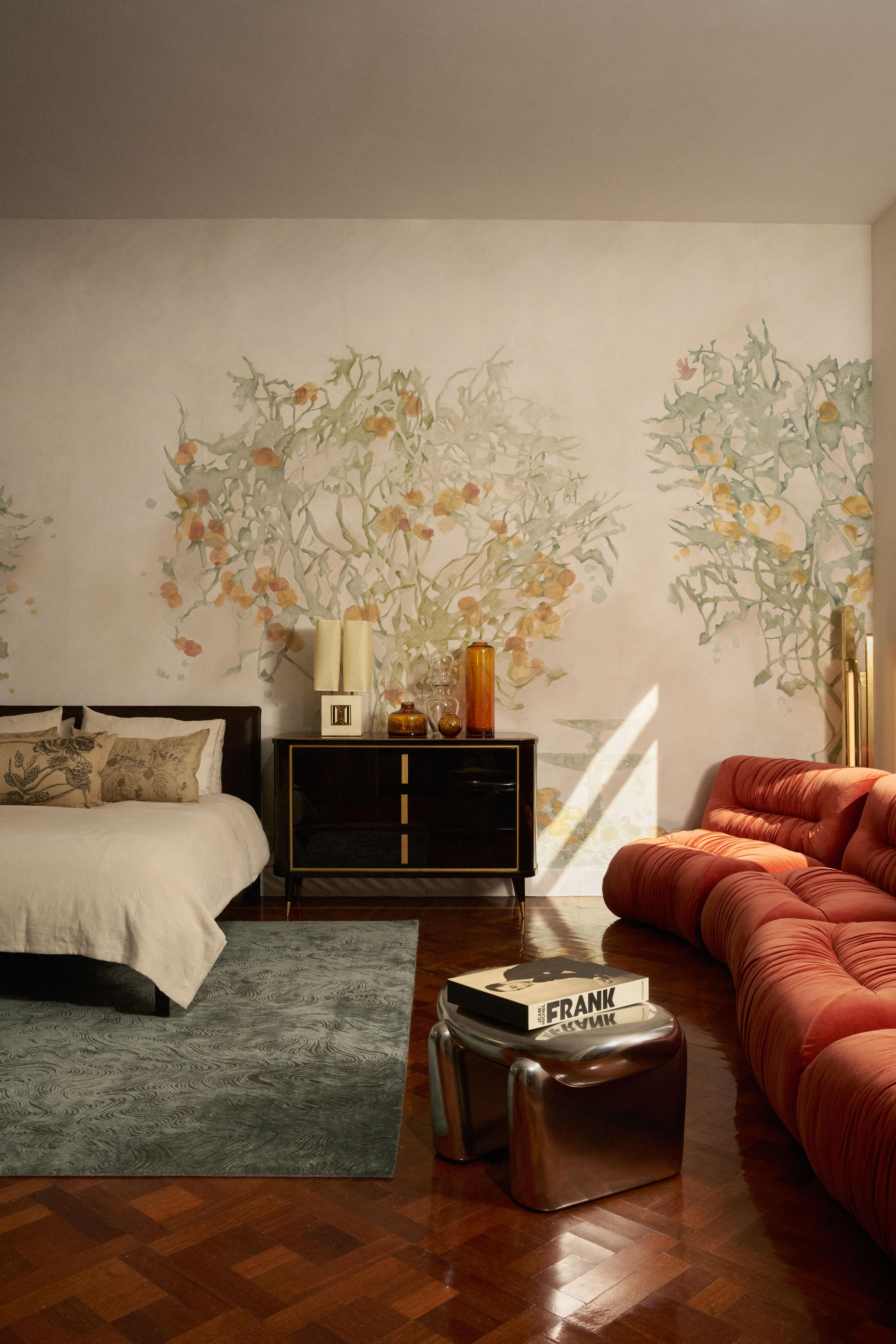 A striking cylindrical chandelier of hand-crafted ivory majolica illuminates twin rugs in deep terracotta and soft sunset hues. Venetian mirrors, gilded artworks, and cloudlike sofas set the scene, while a whimsical ostrich sculpture conceals a lacquered bar filled with silver wine glasses and engraved crystal bottles. The vanity room’s cinematic charm flows into the elegant bedroom, where a modernist bed contrasts against a hand-painted wallcovering of citrus trees. A sinuous orange velvet sofa, a silver-coated stool, and a marble-painted chair blend sculptural elements with effortless chic.