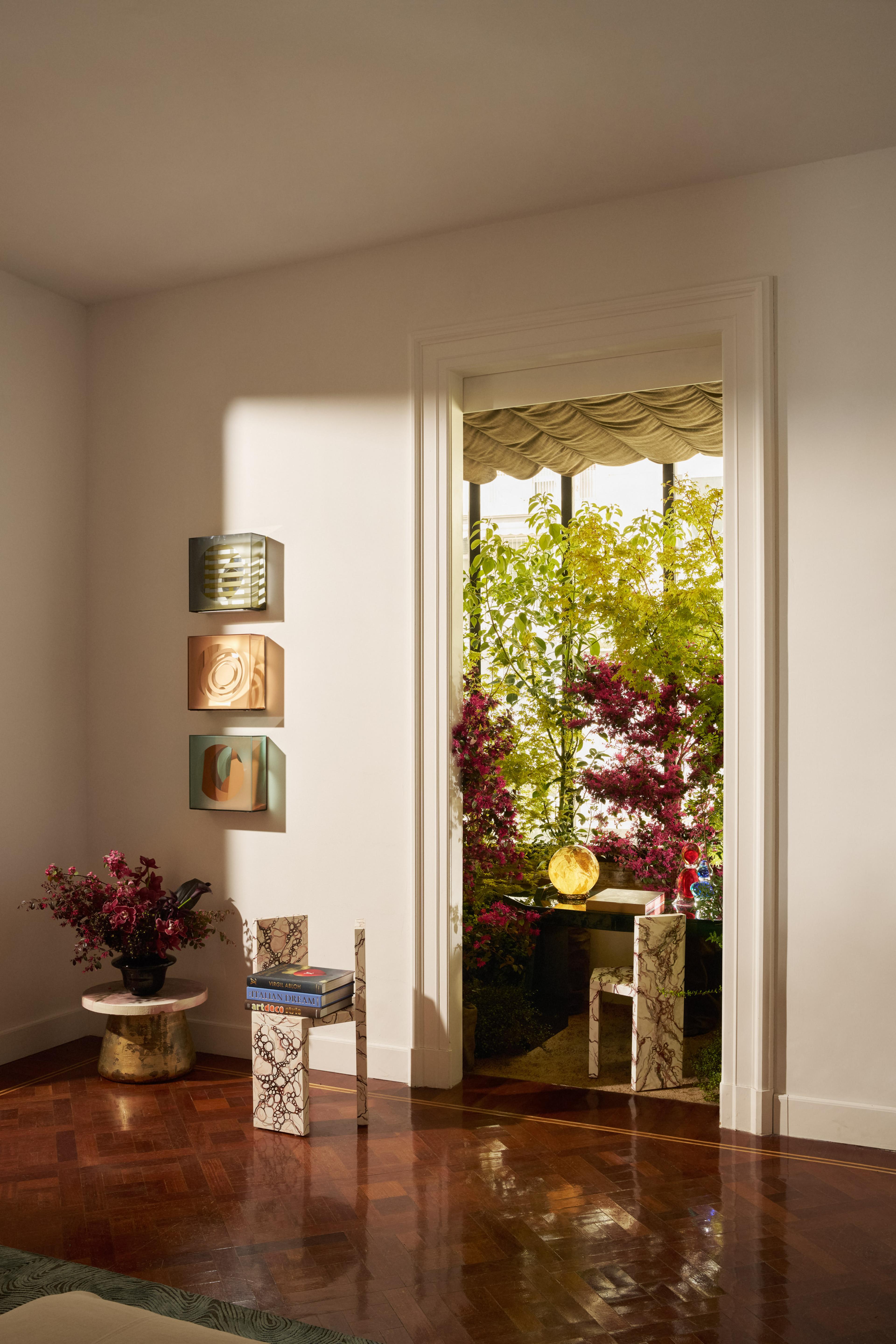 Adding a moment of quiet sophistication, the terrace transforms into a refined study with a green lacquer desk and ethereal three-dimensional artworks, capturing the essence of Italian allure.