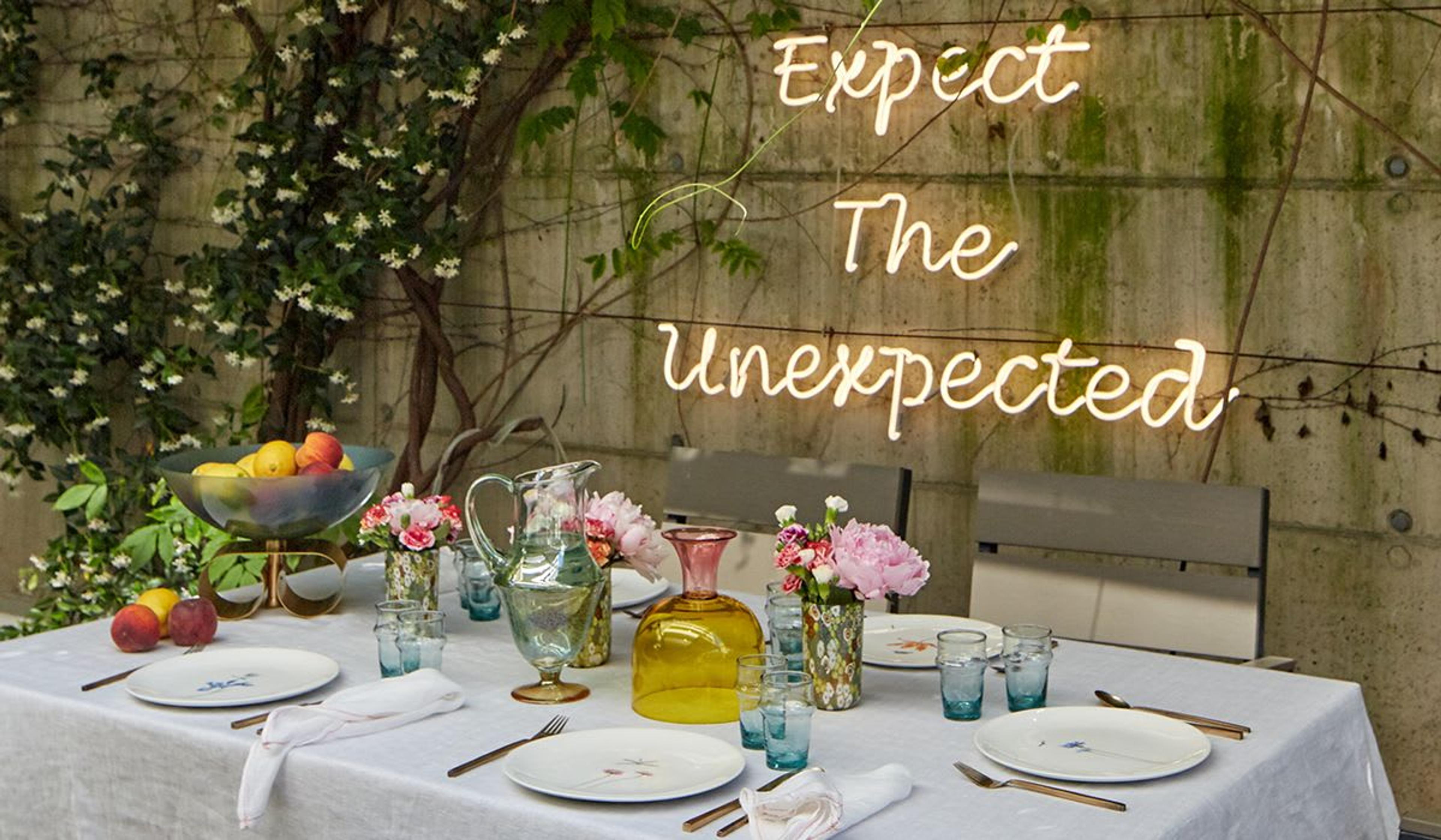 Nestled in a brand-new modern building, the apartment is equipped with a stunning garden, a fairly uncommon luxury to have in the city. The garden features a long table perfect for entertaining and enjoying the warm Italian summer nights; decorated with amber Murano glass sets by La Fornasotta, elegant glass pitchers by Creart and dinner plates by Laboratorio Paravicini, the setting plays with colors and glass reflection and results in a curated and original table, right under Marco's neon signs showcasing "Expect The Unexpected", a creative memento.