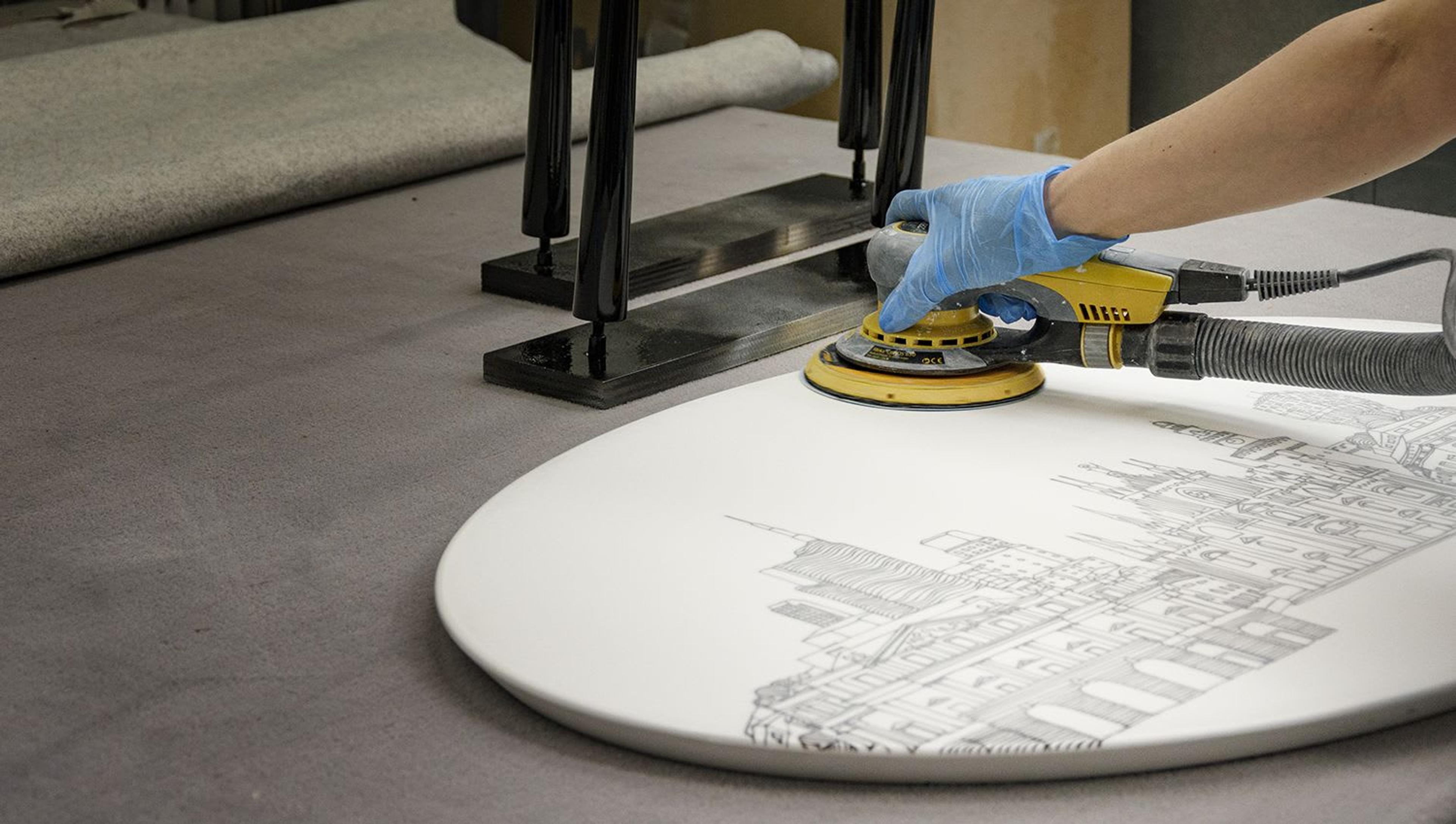 The first collaborations emerged from friendships with special, talented individuals, not only in design but also in illustration, fashion, and decorative arts. Anna Sutor was among the first: I adore her style and I have asked her to reinterpret some tables using her drawings. The result is the “Close Up” series of small tables with illustrations of Italian cities, which is still one of our best sellers.