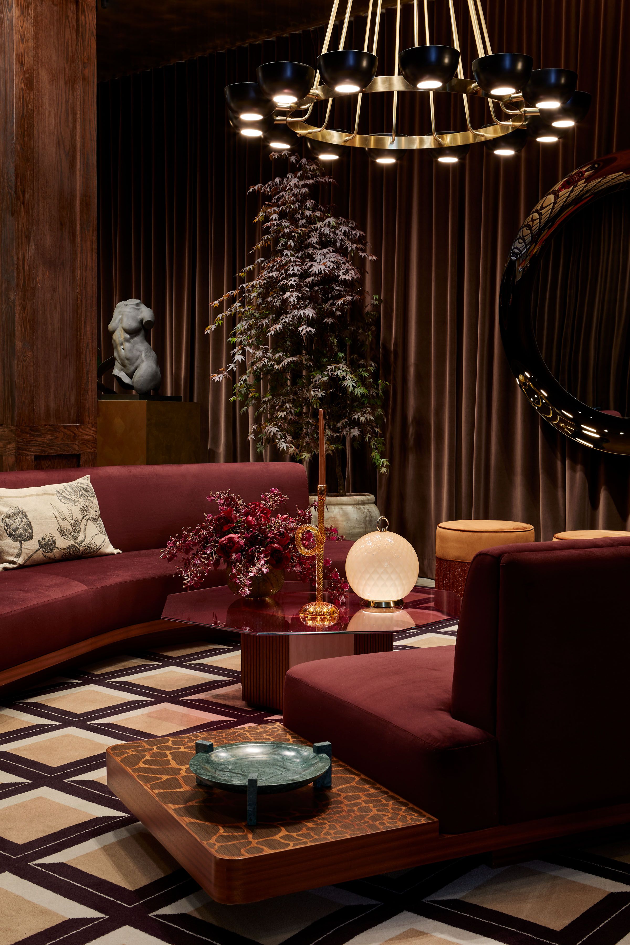 Inspirándose en la discreta opulencia de los años setenta, Nicole Fuller fusiona líneas limpias y siluetas minimalistas con materiales suntuosos como el terciopelo, el cuero, los metales pulidos y las superficies espejadas. El resultado es un espacio que refleja un cuidado equilibrio de sobriedad y opulencia, donde los tonos joya y los neutros cálidos interactúan con acentos de latón y oro. Las discretas influencias del Art Déco aportan belleza escultórica y precisión arquitectónica, creando un entorno atemporal que refleja la elegancia sin esfuerzo del diseño italiano.