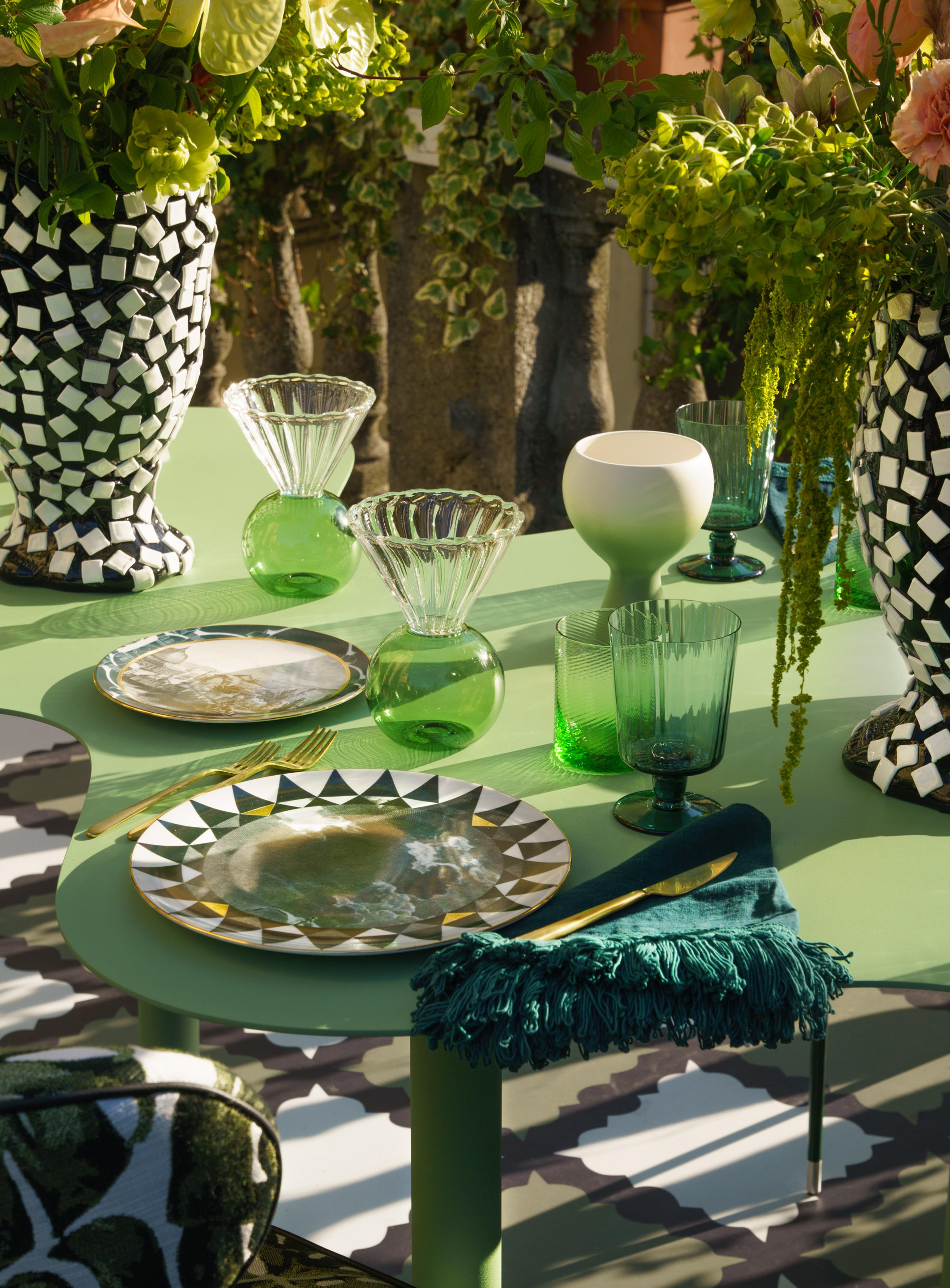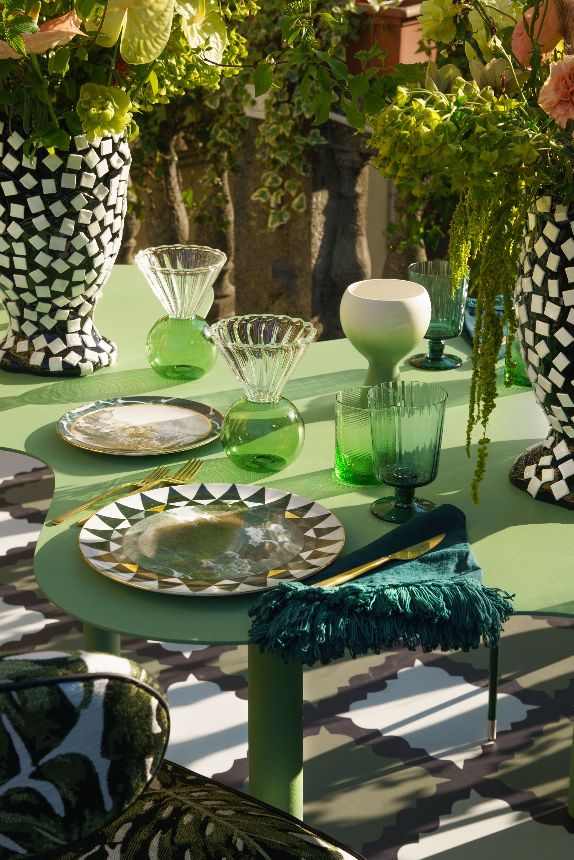 Era importante che la terrazza avesse la stessa importanza dell'interno, pur supportando la nostra estetica e il modo in cui affrontiamo tutti i nostri progetti. Abbiamo quindi introdotto i pattern e i colori saturi che ci contraddistinguono. Fortunatamente, siamo riusciti a trovare le giuste soluzioni grazie all'elenco di splendidi artigiani e artigiane di Artemest, che forniscono una varietà incredibile di pezzi unici.