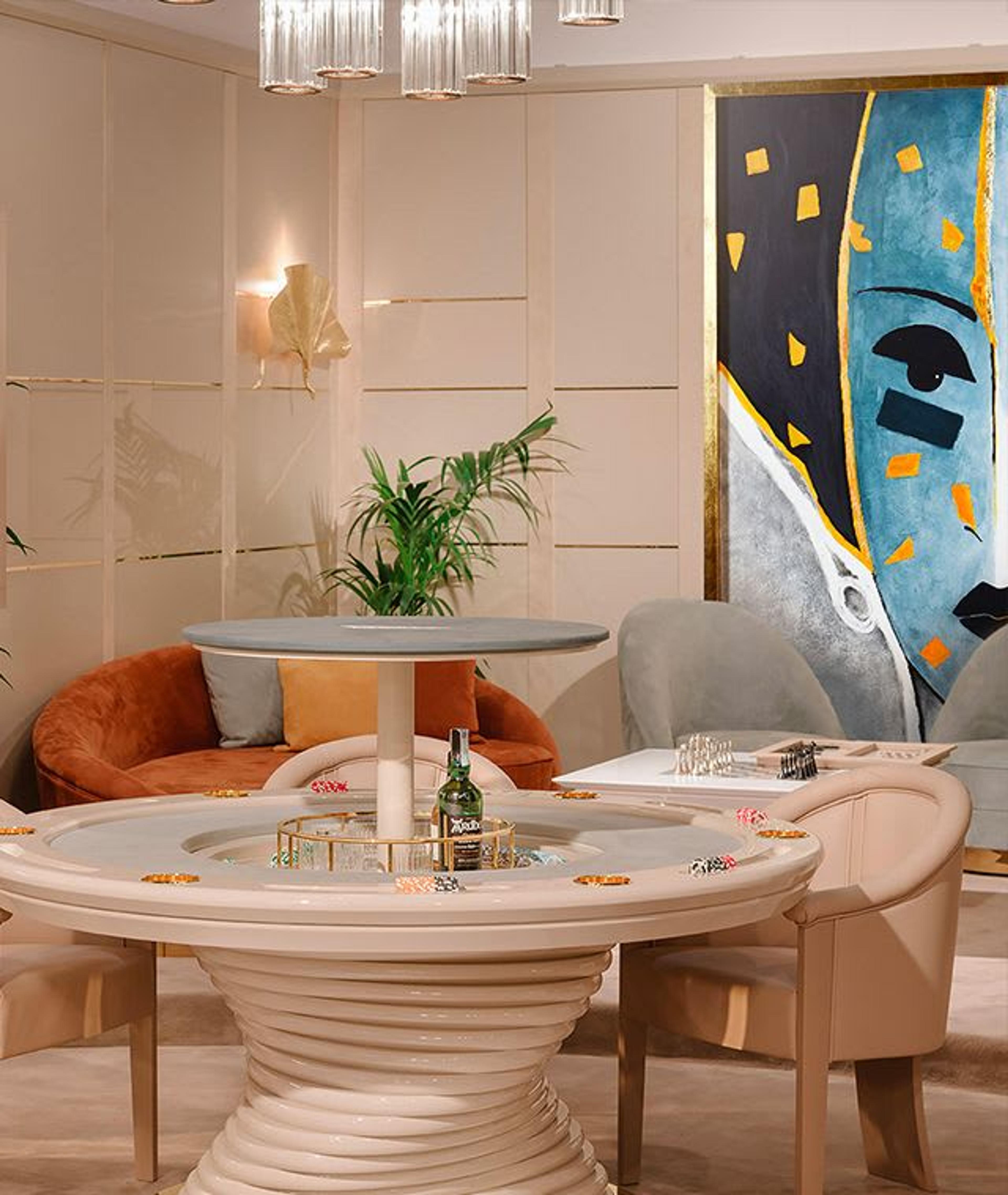 Un'aggiunta unica a un progetto di ospitalità, la sala giochi è stata progettata pensando a un'atmosfera raffinata e lussuosa, uno spazio per il tempo libero dopo cena per ogni intenditore. Le tonalità scure dei tavoli in legno sono completate da pezzi luminosi dalle silhouette classiche, mentre le luci soffuse sul pavimento e sul soffitto completano il look.